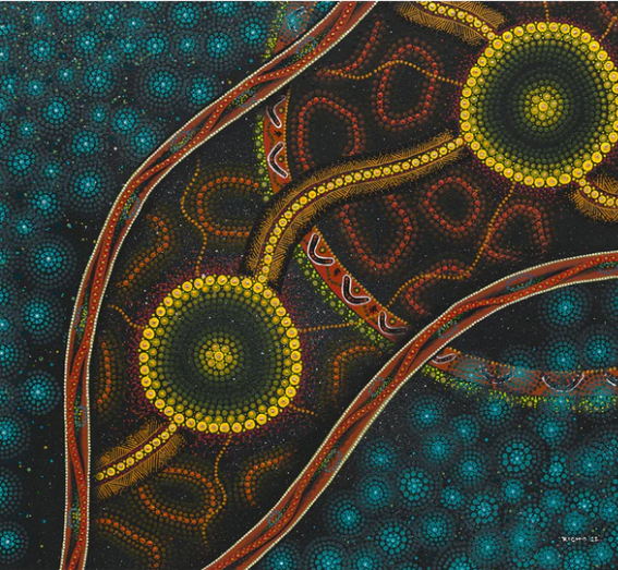 Richard follows three generations of artists and also has family roots from Roebourne/Yindjibarndi Country. Richard's work combines traditional colours and techniques with a contemporary perspective to create unique pieces. Much of Richard's inspiration and themes have emerged from the importance of family connections and finding and celebrating identity.