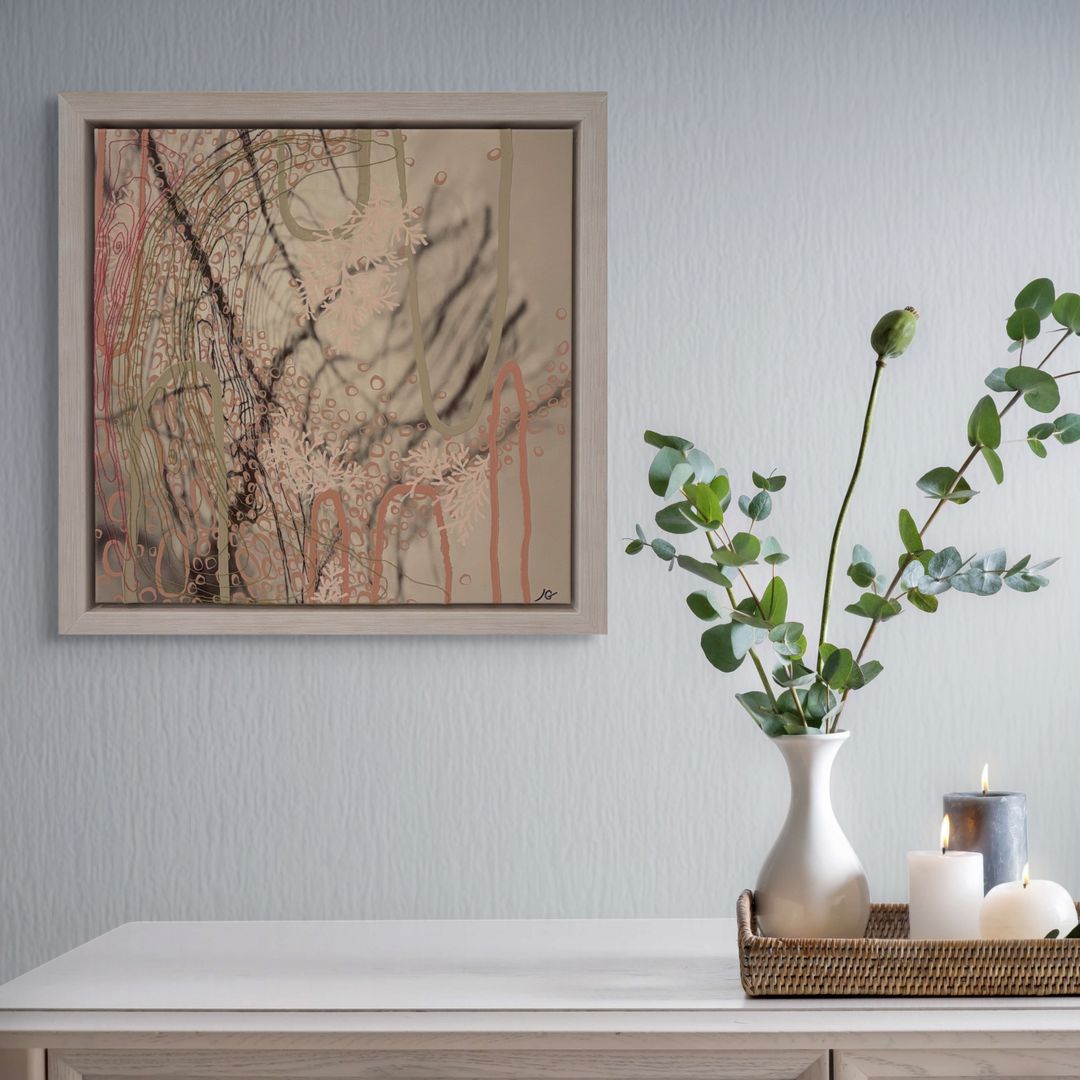Stretched and float framed in a chunky white wash wood frame