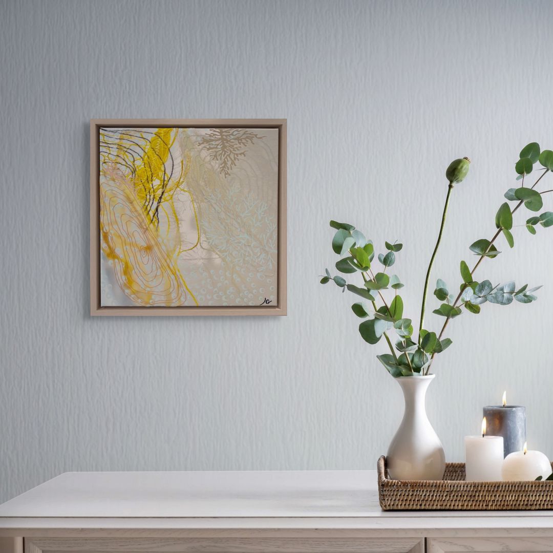 Stretched and float framed in a white wash wood frame.